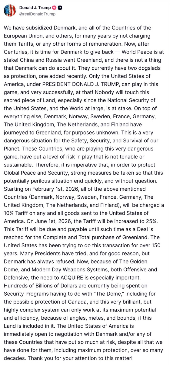 иными формами вознаграждения. Теперь, спустя столетия, Дании пришло время вернуть долг — на кону мир во всём мире. Китай и Россия хотят Гренландию, и Дания ничего не может с этим поделать. В настоящее время их защита состоит из двух собачьих упряжек, причём одну добавили недавно. Только Соединённые Штаты Америки под руководством ПРЕЗИДЕНТА ДОНАЛЬДА ДЖ. ТРАМПА могут играть в эту игру и делать это весьма успешно. Никто не посмеет тронуть этот священный клочок земли, особенно учитывая, что на карту поставлена национальная безопасность Соединённых Штатов и всего мира. В довершение всего Дания, Норвегия, Швеция, Франция, Германия, Соединённое Королевство, Нидерланды и Финляндия предприняли экспедиции в Гренландию с неизвестными целями. Это крайне опасная ситуация для безопасности, защищённости и выживания нашей планеты. Эти страны, играющие в столь опасную игру, создали неприемлемый и недопустимый уровень риска. Посему, в целях защиты глобального мира и безопасности, настоятельно необход