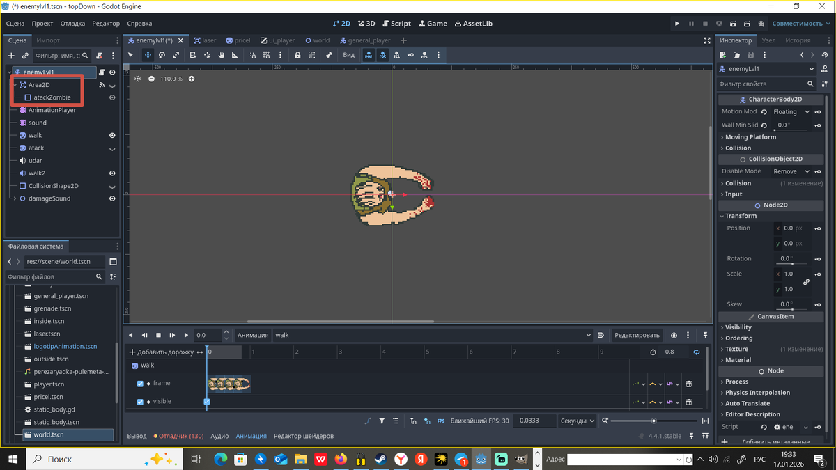 Разберем нод среднего зомби. Первый нод это Area 2d он отвечает за зону в которую входит главный герой и после чего зомби начинает атаковать. Второй нод Animation Player отвечает за анимации, такие как удар,бег,смерть(у меня отдельной сценой сделана) и под ней такой же нод sound, который включает звуки в нужное время. Дальше у нас идут ноды обычного спрайта walk(ходьба) и udar(атака). Я сделал так что бы они у меня переключались между атакой и бегом. Collision Shape-это коллизия столкновения с объектами и игроком. И в самом конце несколько звуков при получении урона(они воспроизводятся рандомно). В следующей статье разберем ноды главного персонажа.