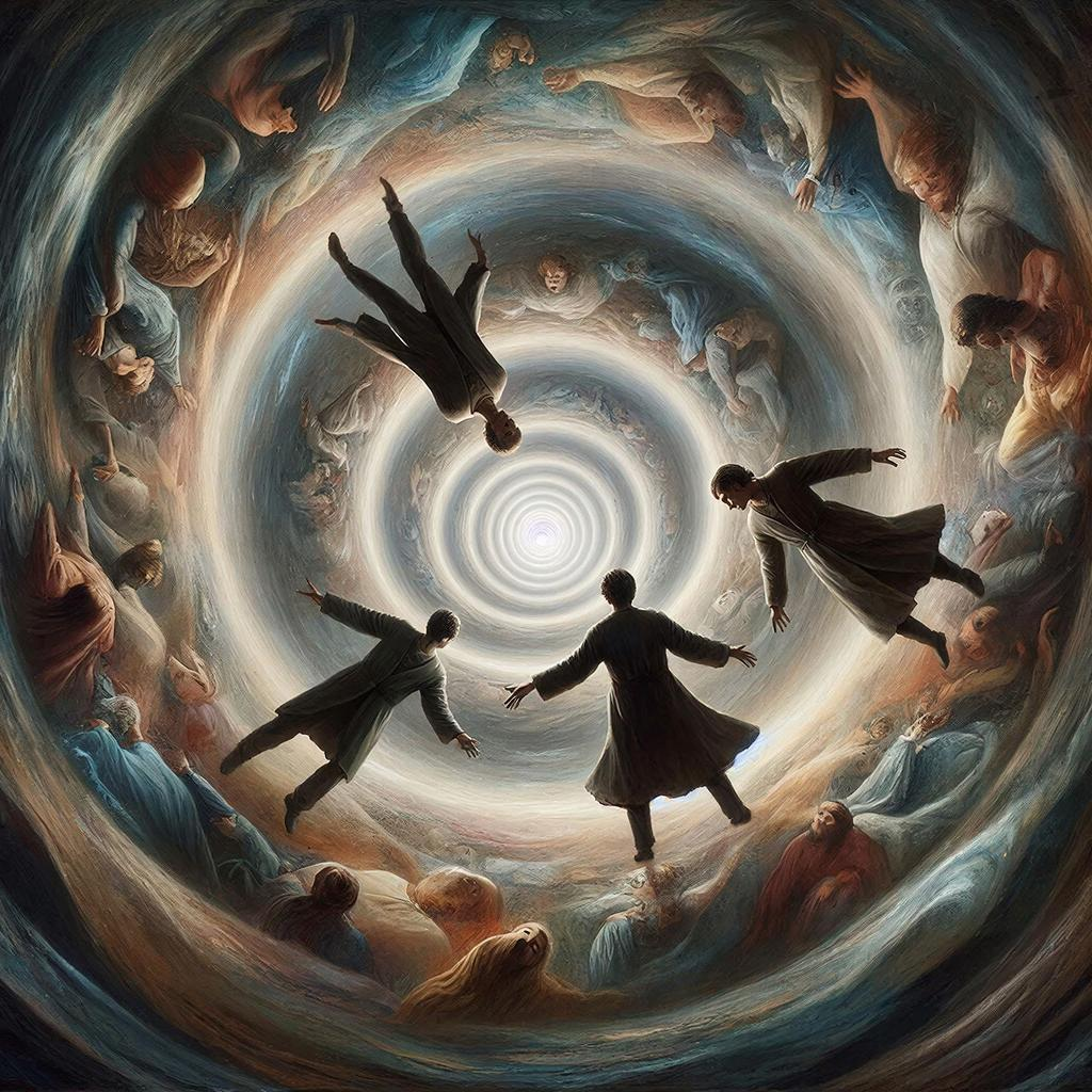 «Все трое, не сговариваясь, шагнули в воронку и полетели сквозь пространство и время, наблюдая на стенках воронки картины своих прошлых и будущих жизней. Картинки, как и мысли в их головах, сменяли друг друга с непостижимой для восприятия обычного человека, скоростью, но сейчас они не были обычными людьми. В их силах постичь все таинства мироздания, разом, как постигает Бог и показывает им всё это прямо сейчас. Мозг человека не способен воспринимать такое обилие информации, потому и существует Божья искра, которая призвана управлять сознанием и мозгом человека, без неё человек – это просто биоробот, аватар. Эгоистичное сознание, просто-напросто, не смогло бы достичь дна этой кроличьей норы, растворилось бы в ней и ушло в небытие. Они поняли, что отождествлять себя с телом, сознанием и умом – это самая большая ошибка людей, забывших свою истинную природу. Печально, но они, через несколько мгновений, тоже обо всём забудут и та самая искра будет тщетно пытаться до них достучаться. Сейчас