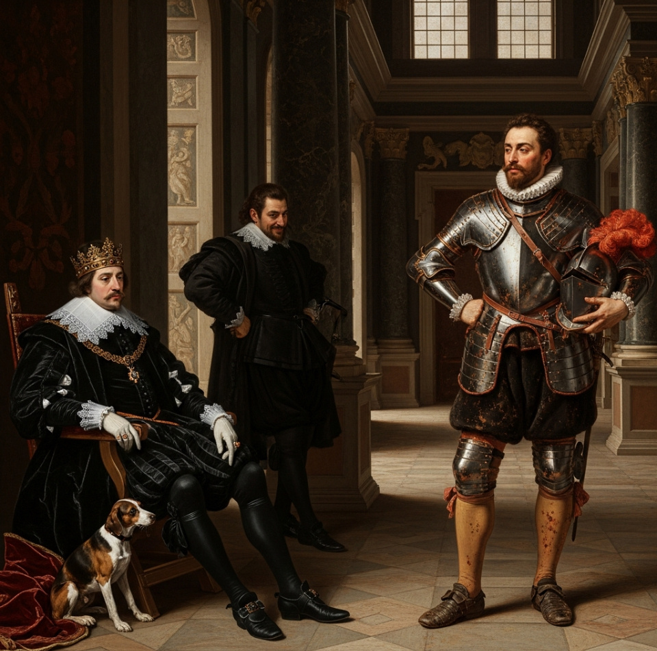 Тишина повисла густая, как смола. Каждый придворный, затаив дыхание, смотрел то на бледного, изнеженного короля в бархатном камзоле, то на богатыря в латах, пропахших порохом и конским потом.