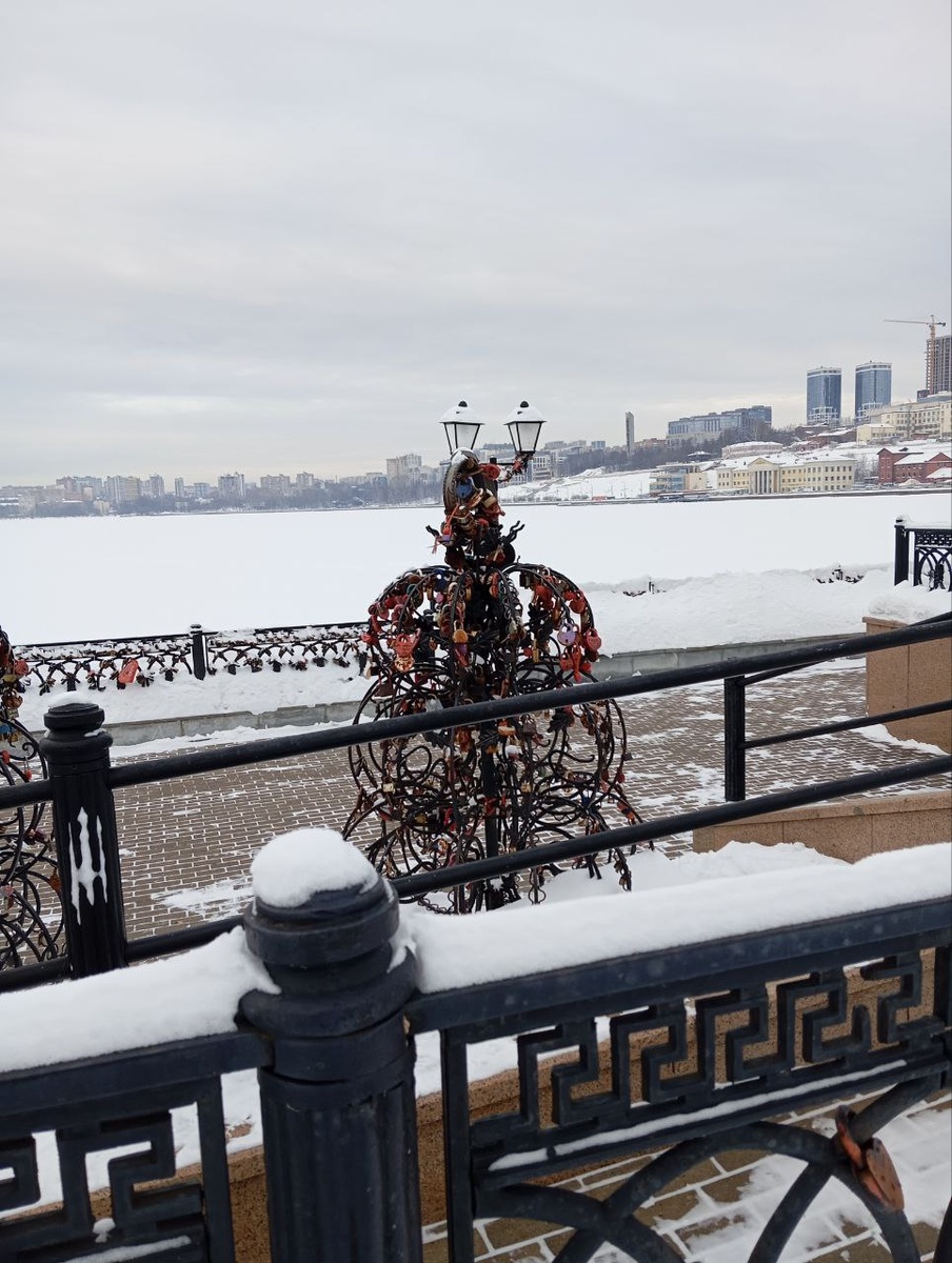 Прогулялся по набережной реки ИЖ. Популярное место у брачующих, закрывают сердца замочками и ключи скорее всего бросают в реку.