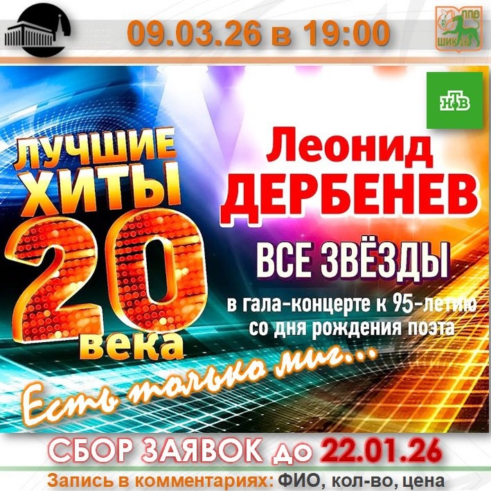 Гала-концерт «Есть только миг между прошлым и будущим», посвящённый 95-летию со дня рождения поэта. 📆 9 марта 2026 года в 19:00 🏛 Государственный Кремлёвский Дворец 🎫 Балкон середина 3, 4 ряды - 2700₽ 🎫 Партер 26, 27, 28 ряды - 3600₽ 👛 Цены указаны со скидкой в 10% «Есть только миг», «Все могут короли», «Остров Невезения», «Гадалка», «Куда уходит детство?», «Этот мир придуман не нами», «Три белых коня» и многих других. На счету поэта более 2500 песен, большинство из которых стали народными хитами. Музыку на стихи Дербенева писали Александр Зацепин, Арно Бабаджанян, Вячеслав Добрынин, Максим Дунаевский, Евгений Мартынов, Эдуард Артемьев, Александр Журбин, Давид Тухманов, Юрий Антонов, Александр Морозов, Игорь Крутой и другие. В этих творческих союзах появились песни, которые поют и сегодня. А песня «Лучший город Земли» стала неофициальным гимном Москвы! ✨Песни маэстро в этот день придут исполнить звёзды российской эстрады. Концерт проводится при поддержке Министерства Культуры