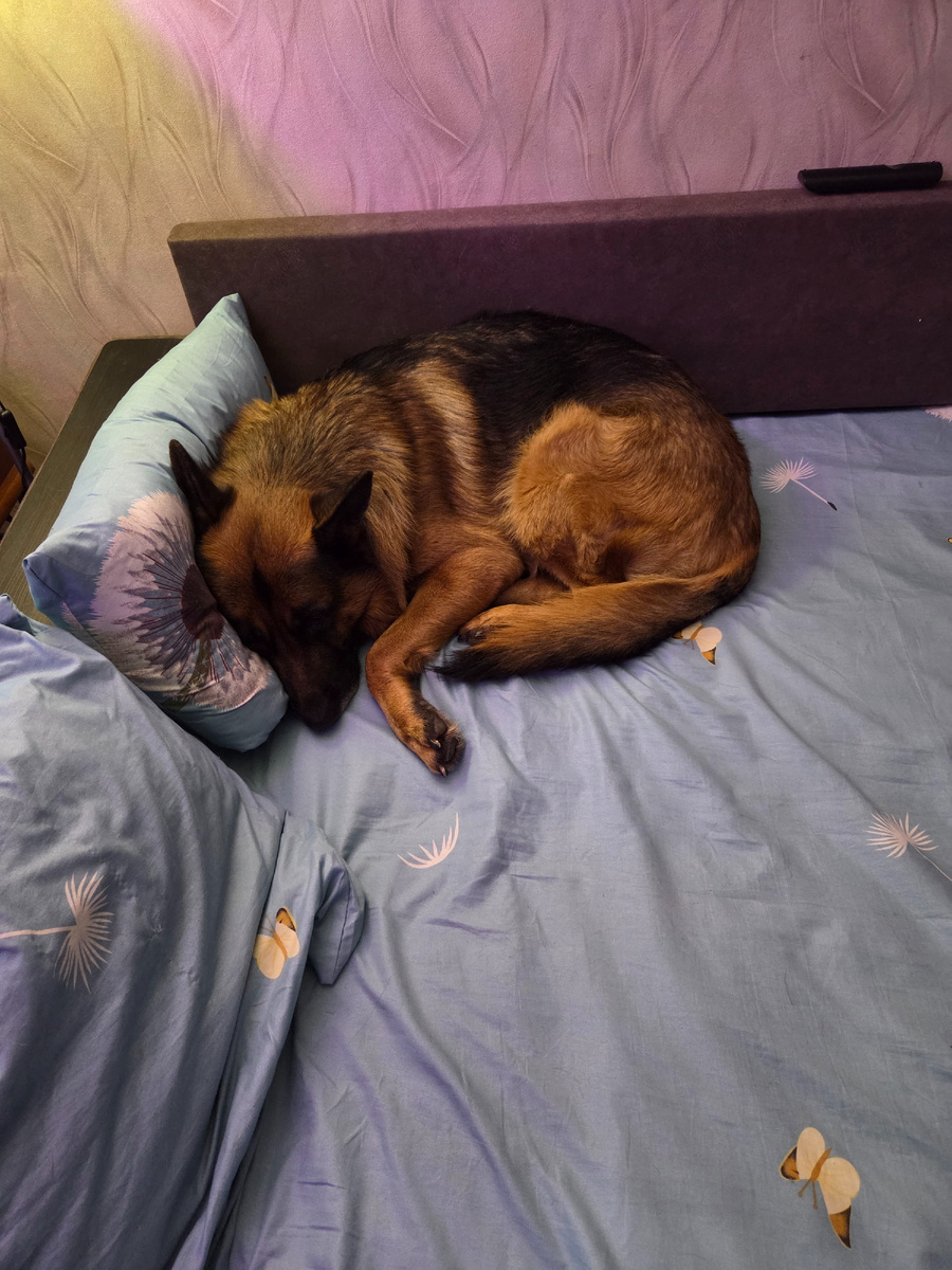 Рекс, как всегда, занял место хозяйки. Вот глупый, намного же лучше ложиться вместе с хозяйкой! А еще лучше - залезть под одеяло)