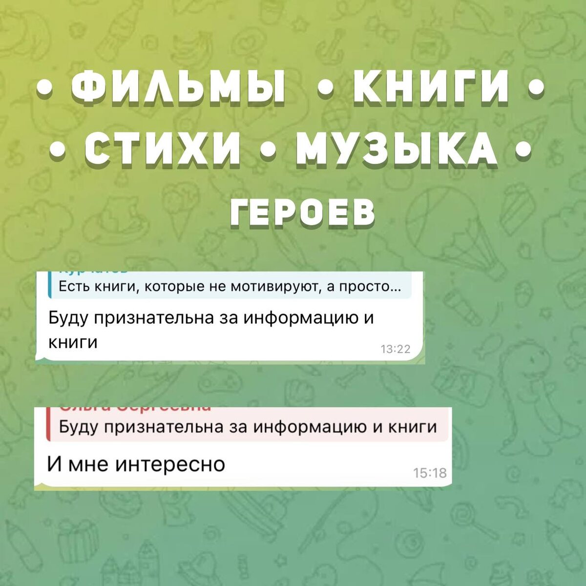 Ловите ссылки на наши каналы с геройскими книгами, фильмами, стихами и музыкой. Эти ресурсы помогут найти в себе или в ребенке героя. Вдохновляйтесь! Смотрите, слушайте, учите, обсуждайте вместе с детьми: ✅ Фильмы ✅ Музыка ✅ Книги ✅ Стихи ✅ Читающая среда СТРАНА ГЕРОЕВ. ПОДПИСАТЬСЯ