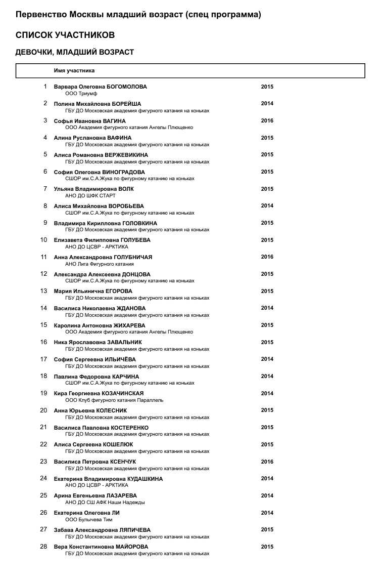 Добрый день, дорогие читатели! Стало известно Расписание Первенства Москвы младшего возраста (спец программа). Турнир является отборочным на Первенство России младшего возраста. 19 января 11:45 – девочки (старший возраст), КП 17:45 – мальчики (старший возраст), КП 20 января 12:00 – девочки (старший возраст), элементы 15:25 – мальчики (старший возраст), элементы 18:00 – мальчики (младший возраст), КП 21 января 10:00 – девочки (старший возраст), ПП 13:20 – девочки (младший возраст), КП 22 января 10:00 – мальчики (младший возраст), элементы 11:55 – девочки (младший возраст), элементы 15:20 – мальчики (старший возраст), ПП 23 января 10:30 – мальчики (младший возраст), ПП 12:15 – девочки (младший возраст), ПП Список всех участников можно посмотреть в Приложении ниже. Листайте галерею вправо. Всем спасибо за прочтение.