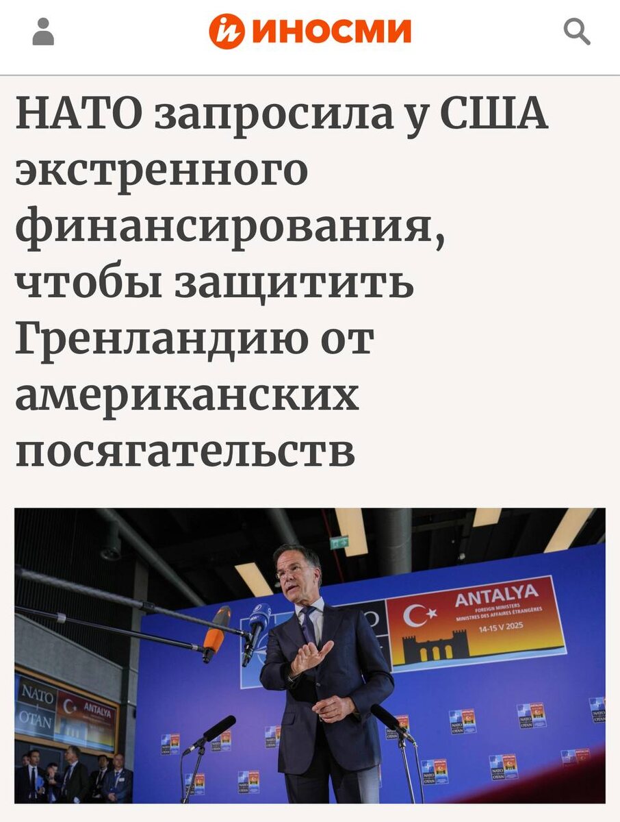 : «На фоне довлеющей угрозы военного захвата Гренландии американскими войсками НАТО запросило у США чрезвычайную помощь, чтобы защитить Гренландию от США». Но нет, не анекдот. Я даже не знаю как это комментировать. Абсурд.