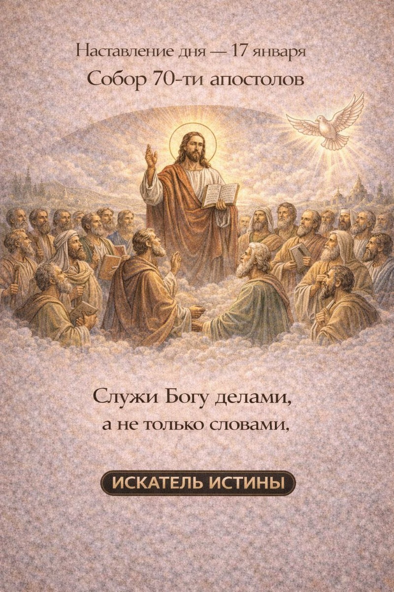 Собор 70-ти апостолов В день Собора 70-ти апостолов Церковь вспоминает учеников Христовых, которых Господь избрал и послал проповедовать Евангелие по всей земле. Они не искали славы и почестей, но с верой и самоотвержением несли слово Божие, утверждая Церковь в истине и любви. Этот праздник напоминает нам, что каждый христианин призван быть свидетелем Христа — не громкими словами, а жизнью, наполненной верой, смирением и делами любви. Пусть и твой день будет наполнен верностью призванию, благодарностью Богу и готовностью служить ближним.