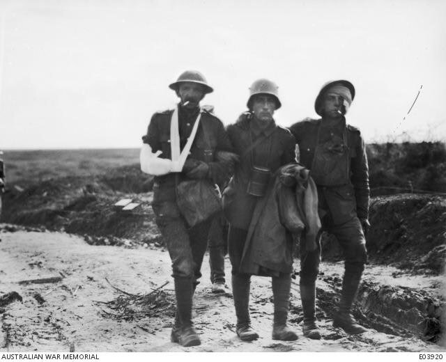Двое раненых британских солдат после битвы за линию Гинденбурга, идут с немецким военнопленным до пункта оказания первой помощи, Эна