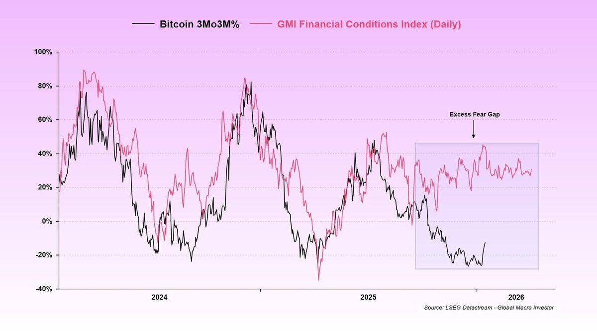 Иногда полезно просто отойти на шаг назад. Не спорить с графиком. Не доказывать сценарий. А посмотреть, кто с кем сейчас не совпадает. Есть ликвидность. Есть акции — почти на хаях. Есть кредит, риск, small caps — всё ведёт себя так, будто деньги в системе продолжают прибывать. И есть биткоин. Он будто живёт в другом времени. Как будто цикл уже развернулся. Как будто ликвидность сказала своё последнее слово. Так не бывает, чтобы все были правы одновременно. Либо рынок акций фундаментально ошибается, игнорируя реальность ликвидности. Либо биткоин заранее закладывает то, чего в данных пока нет. И вот здесь начинается самое интересное. Потому что если убрать эмоции и оставить только цифры — глобальная ликвидность ещё не показала пик. Финансовые условия не ужесточаются так, как это обычно бывает перед разворотом. Риск-активы в целом ведут себя логично для растущей денежной среды. А значит, на данный момент именно биткоин выглядит аномалией. Мне особенно цепляет не сам факт расхожден