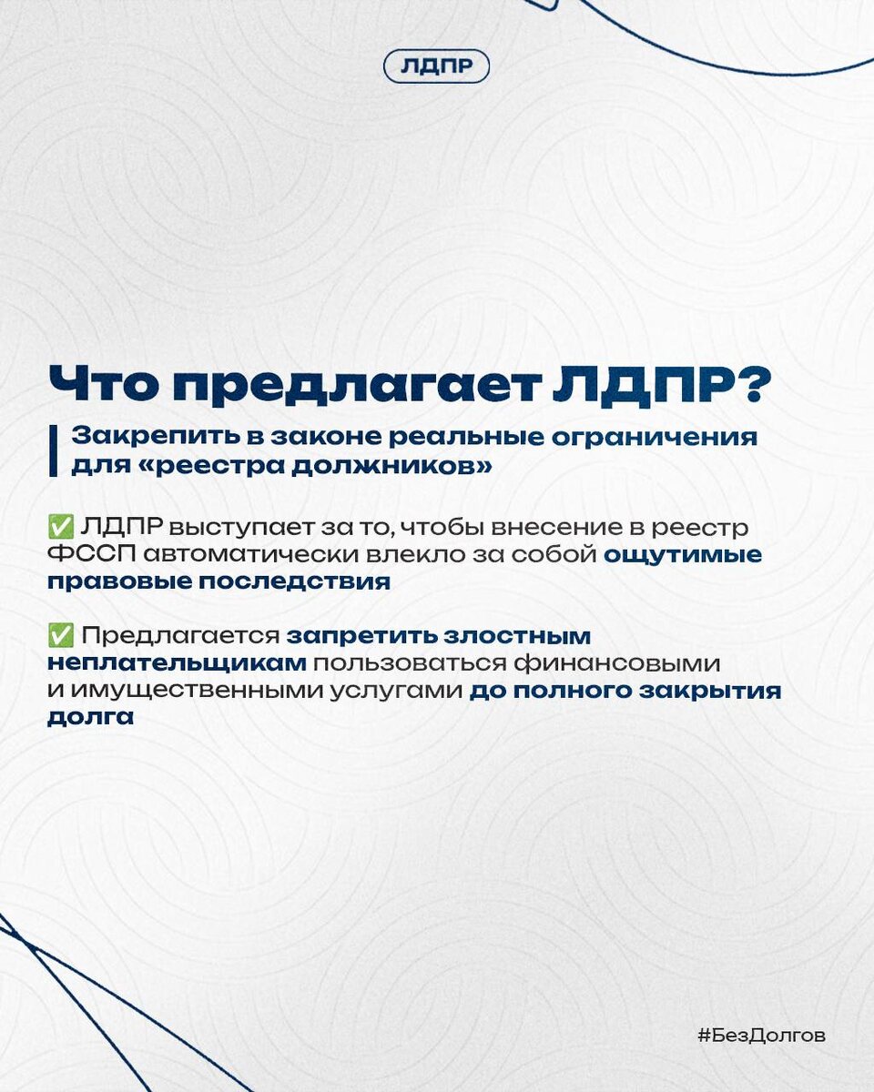Сегодня в России работает открытый реестр неплательщиков алиментов. Но пока это скорее «доска позора», которая не пугает тех, кто привык скрываться от ответственности. Леонид Слуцкий и фракция ЛДПР предложили наделить список юридической силой. Если ты в реестре — закрываются двери банков и регистрационных палат. ❌ Никаких новых кредитов или покупки машин, пока долг перед собственным ребёнком или пожилым родителем не будет погашен. Подробности инициативы — в карточках.