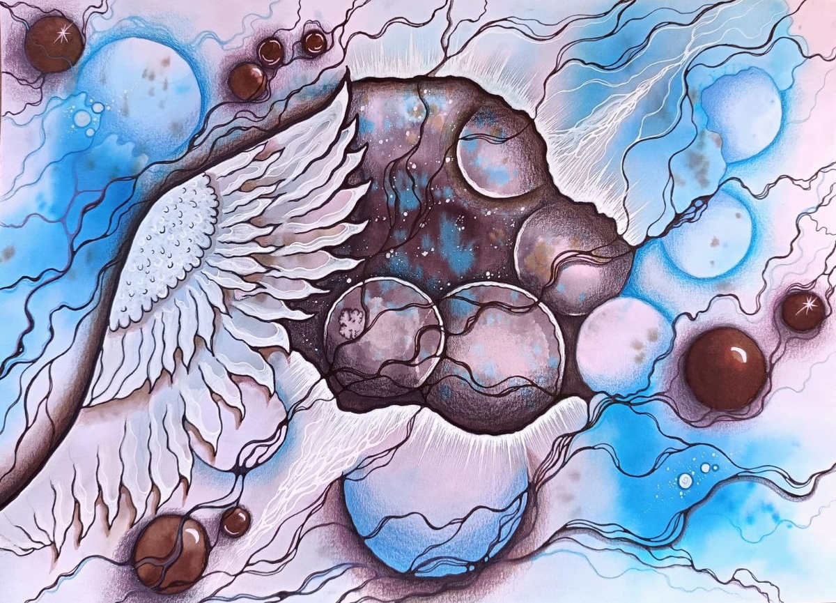 Маловероятно, что я сама бы решила рисовать восток и уж, тем более, морских чудовищ, но в разводах красок увидела именно это. Подводный мир - отдельная любовь, не совсем нейрографика, но меня поразило, как после красок и плёнки картина нарисовалась как будто сама. Даже возникли мысли, что именно так кто-то и сотворил наш мир. Разлил краски, что то получилось идеально, что то так себе, но всё вместе взаимодействует, переплетается, общается и создаёт свою гармонию.