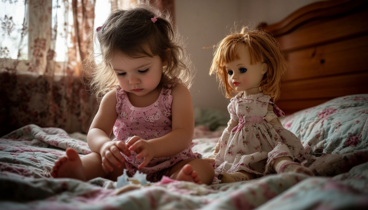 Алиса сидела на кровати, спиной к двери. На ней было испачканное платьице, колготки с пузырями на коленках. Она что-то неразборчиво бормотала себе под нос, водя по одеялу куклу без руки.