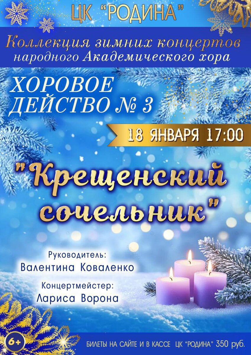 » Вновь с нами Академический хор Центра культуры «Родина» под руководством Валентины Коваленко и третье событие из коллекции сказочных зимних концертов. ✨✨✨ «Крещенский сочельник» - необычное хоровое действо, в котором гостей ждёт круговорот душевных музыкальных номеров, знакомых традиций празднования светлого праздника Крещения Господня, приметы, гадания, игры и сюрпризы. ⠀⠀⠀ 📆 Дата: 18.01 ⏰ Время: 17:00 📍 Место: в Каминном зале 🎟 Цена: 350₽