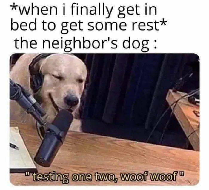 когда я наконец ложусь в кровать, чтобы немного отдохнуть соседская собака: проверка, один два, гав гав