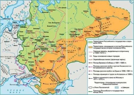 Раз пришёл запрос: «поподробнее написать о территориях, присоединённых Иваном Грозным», то пристало и ответ держать. На карте – всё, что зелёным, Иоанн Васильевич получил в наследство. Всё, что оранжевым на Востоке и на Юге, – приобретения. А вот заштрихованные области на северо-западе есть потери в чистом виде. Первая территория – Казанское ханство. 1552 год, со взятием Казани, положил начало освоения Поволжья и приведения к покорности многочисленных народов, помимо самих татар. Башкиры, мордва, черемисы… Локальные войны, походы и экспедиции продолжались ещё почти век. Вторая территория – Астраханское ханство. 1556 год – только взятие Астрахани. Наведения порядка на нижней Волге затянулось на несколько десятилетий. Третья территория – земли Ногайской орды. Часть нынешнего Северного Кавказа. Малая орда признала власть Московского царя, Большая орда откочевала за Волгу, в степи нынешнего Казахстана. Четвёртая территория – ханство Сибирское. Ермак разбил войско хана Кучума в 1582 году.