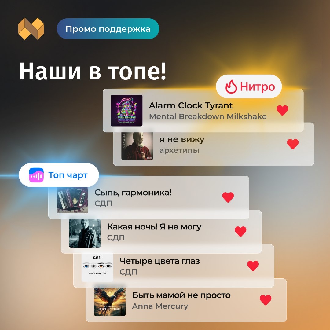 ! 🚀Начало 2026, а наши артисты уже в топах музыкальных чартов 🔥 Отдельно радует, что СДП в Яндекс Музыка / Нитро уверенно закрепился и чувствует себя там более чем комфортно — прочная позиция и отличный задел на рост 💪 Яндекс Музыка / Нитро: СДП — «Сыпь, гармоника!» — 101 место СДП — «Какая ночь! Я не могу» — 102 место СДП — «Четыре цвета глаз» — 116 место Anna Marcury — «Быть мамой не просто» — 196 место VK Музыка / Топ-чарт: Mental Breakdown Milkshake — «Alarm Clock Tyrant» — 4 место архетипы — «я не вижу» — 16 место Спасибо всем, кто с нами и кто слушает, поддерживает и верит 💙 Двигаемся дальше — Мы только набираем обороты 🎶✨