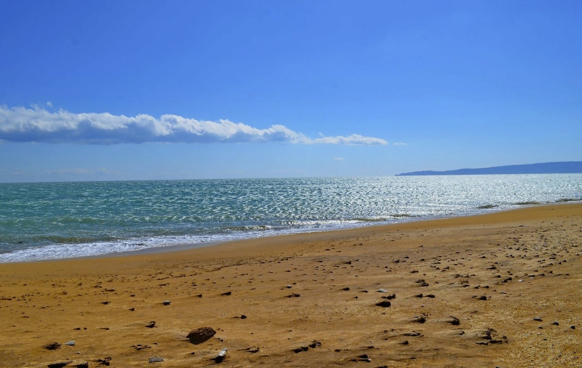 Если идти дальше, до «Восхода», там становится лучше. Пляж шире, песок местами натуральный, и я заметила что людей намного меньше. Вид на залив хороший, спокойно там, просторно. Но вот вход в воду не везде безопасный, местами плиты под водой, их с берега не видно. Я видела как одна женщина, тоже с сумкой через плечо как у меня, зашла, а потом резко отпрянула, видно на что-то наступила. Я потом аккуратно заходила чуть правее, там вроде норм.