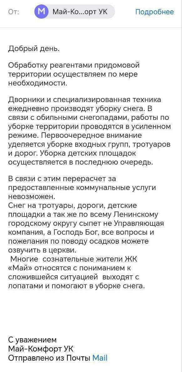 ». Управляющая компания Подмосковья отказала жильцам в проведении перерасчета платы за уборку снега, аргументируя свою позицию объективными факторами возникновения осадков. Представитель организации заявил, что уборка территории зависит не столько от управляющей компании, сколько от погодных условий. Дополнительно было предложено обратить внимание на положительный опыт жителей соседнего жилого комплекса, самостоятельно организовавших расчистку дворов. А по заявлению в Прокуратуру "боги пера" могут влететь и на 300 000 рубликов 👉 Подписаться | Прислать новость | Чат