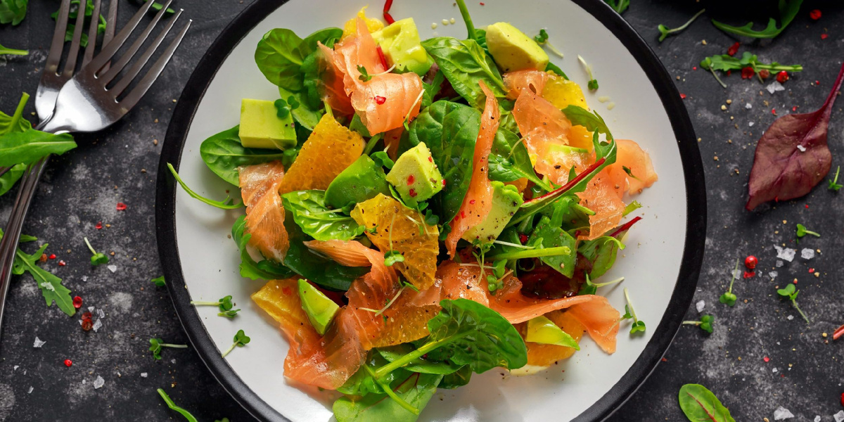 3. Заправьте салат ароматной смесью из облепихи и полейте сверху оставшейся заправкой.