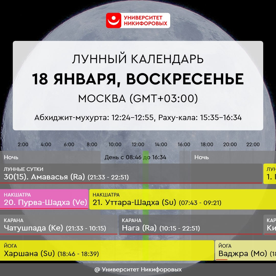 Сегодня последний день лунного месяца, Амавасья. Это прекрасное время для практик почитания Рода, выражения почтения и благодарности своим предкам и всем ушедшим. Зажгите свечу в память о тех, кто был до вас, только не оставляйте открытый огонь без присмотра. Хорошо сходить в храм, подать записочки или заказать поминальную службу. День хорош для духовной практики, чтения молитв и священных писаний. Поразмышляйте о том, что для вас Дхарма, какими правилами жизни вы руководствуетесь, какие из них вы унаследовали от своих предков, а что стало результатом вашего сознательного выбора, жизненного опыта и личностного роста. Умеренная физическая нагрузка, неспешная прогулка станут поддержкой и стабилизируют эмоциональный фон. С одной стороны, конец лунного цикла подталкивают нас к подведению некоторых итогов, с другой, завершение дел не соответствует энергиям дня, потому финальную точку в чем-либо ставить не стоит.