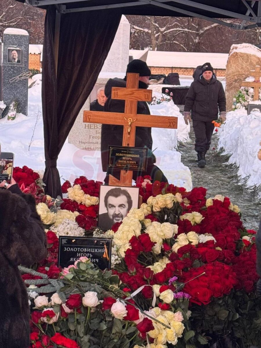 За гробом следовали вдова Вера Харыбина и сыновья Александр с Алексеем. Родные шли с опущенными головами, но женщина не позволила себе слабости и держалась с достоинством. Наследники отметили, что отец всегда учил их оптимизму даже в беде. Лежа в реанимации, на вопрос о здоровье он отреагировал энергично: "Во!" — и поднял большой палец. Эти слова стали символом его характера. Могила расположена на 21-м участке, по соседству с Борисом Невзоровым, ушедшим в 2022-м из-за ковида, а также Борисом Клюевым, Ниной Руслановой и Эдуардом Успенским. В МХТ на церемонию прощания пришли коллеги, друзья и поклонники. Иван Ургант со сцены представил, как Золотовицкий улыбается, разглядывая декорации с обнаженными детьми, и подчеркнул, что актер всегда поддерживал в горе.