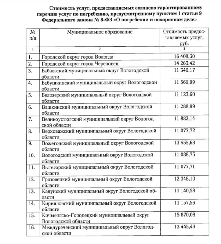 ценообразования частных и муниципальных компаний. В этом уверены представители похоронных бюро. 29 декабря на портале правовой информации опубликовали минимальные суммы, которые потребуется для организации погребения. Этот документ обновляют ежегодно. Указанные суммы меняются с учетом инфляции. Согласно документу, дешевле всего провести похороны можно в Сокольском округе. За услуги придется заплатить порядка 10,5 тысяч рублей. Дороже всего — в Вологде. Здесь цены, в зависимости от статуса умершего, варьируются от 16 до 18 тысяч рублей. Столько денег придется отдать родственникам или представителям усопшего на организацию похорон. Позже потраченные средства вернутся в качестве пособия на погребение. Это гарантированный минимум, предусмотренный федеральным законом. Однако, чтобы проститься с близким необходимо потратить большую сумму. Многие жители обращаются за помощью в частные фирмы. Там, к примеру, на кладбище в областном центре выкопать могилу предлагают за 30 тысяч рублей. Гроб