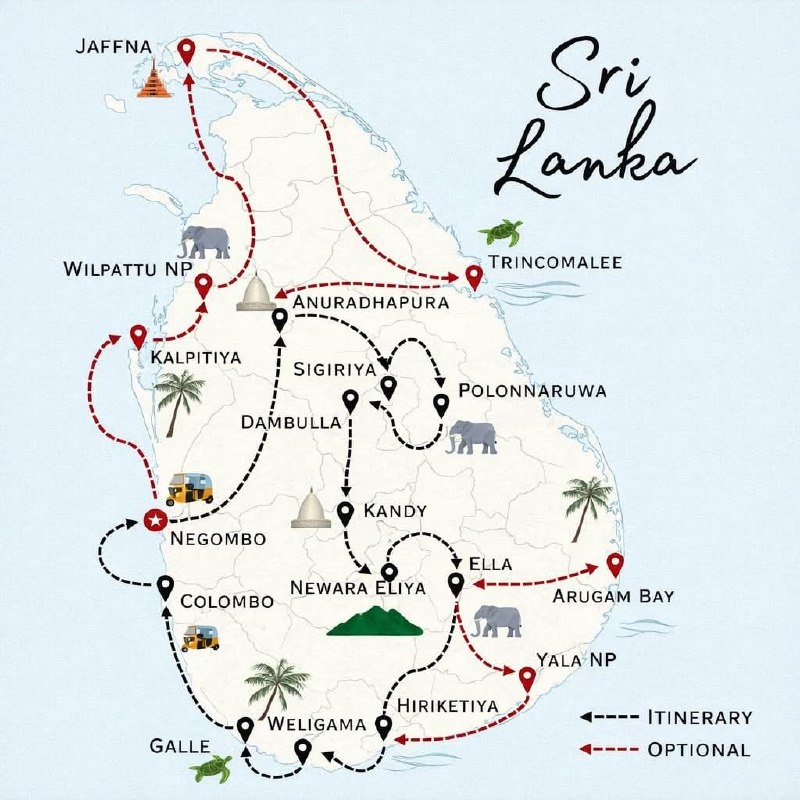 💢От древних королевств до золотых пляжей, туманных гор до захватывающих сафари дикой природы. Шри-Ланка предлагает незабываемое путешествие на одном компактном 😖 Джафна – Откройте для себя яркую тамильскую культуру, исторические храмы и уникальную северную кухню. 🐘 Национальный парк Вильпатту — один из крупнейших национальных парков Шри-Ланки, известный леопардами и нетронутой дикой природы. 🏝️ Калпития – рай для наблюдения за дельфинами, кайт-серфинга и спокойной прибрежной обстановки. 🛕 Анурадхапура – город всемирного наследия ЮНЕСКО, демонстрирующий древние ступы, священные деревья Бодхи и вечную историю. 🗿 Сигирия – Поднимитесь на культовую крепость Львиная скала и насладитесь захватывающими 🛕 Дамбулла - Исследуйте храм Золотой пещеры, украшенный древними статуями Будды и фресками. 🏛️ Полоннарува – Шаг в хорошо сохранившееся древнее королевство, наполненное королевскими дворцами и резьбой по камню. 🌊 Тринкомали – кристально чистые воды, наблюдение за китами и прекрасные пл