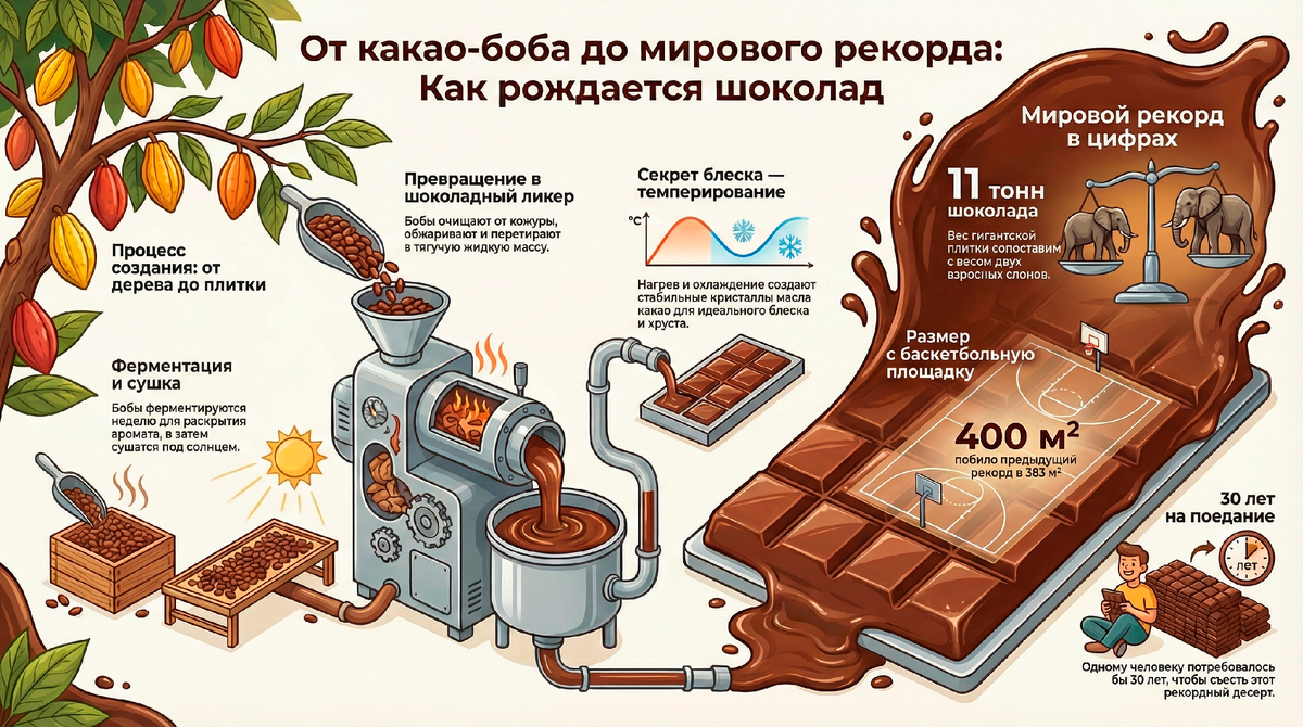 Эй, рекордсмен! Хочешь узнать, как ставят настоящие мировые рекорды? Садись поудобнее — это был самый сложный и вкусный квест в нашей жизни! Миссия: Создать плитку шоколада БОЛЬШЕ, ЧЕМ ТВОЙ ДОМ. УРОВЕНЬ 1: ДЖУНГЛИ. Найти волшебные какао-бобы, похожие на лимоны. Узнать их секрет: оказывается, они должны пропотеть и забродить в коробках, чтобы появился шоколадный вкус! УРОВЕНЬ 2: ФАБРИКА. Проследить путь бобов в страну машин. Здесь их жарят, перемалывают в густую пасту (какао-массу) и смешивают в огромных котлах. Это лаборатория шоколадного волшебства! УРОВЕНЬ 3: СБОРКА ГИГАНТА. Самое сложное! Мы построили гигантскую форму-бассейн. В неё заливали расплавленный шоколад тонна за тонной. Главный враг — ЖАРА. Шоколад плавился быстрее, чем мы успевали! Пришлось вызывать «подкрепление» — больше холодильников и вентиляторов! Это история не только про сладости. Это история про науку, упорство и команду, которая может совершить невозможное. Это путешествие, наука и командная работа, которые мо