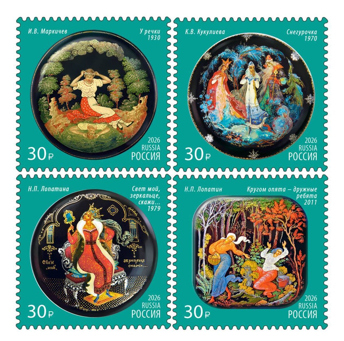 15 января в рамках серии «Декоративно-прикладное искусство России» в почтовое обращение вышли четыре марки, посвящённые Палехской лаковой миниатюре