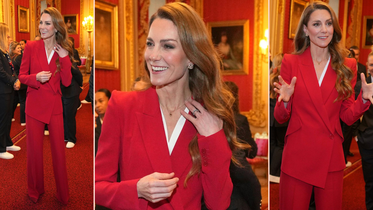 Принцесса Уэльская выглядела потрясающе в алом костюме, когда она приветствовала женскую сборную Англии по регби в Виндзорском замке. Кэтрин мастерски умеет носить строгие костюмы, но ее последний наряд, пожалуй, самый великолепный из всех. Принцесса Уэльская приняла в Виндзорском замке членов женской сборной Англии по регби "Красные розы" на приеме в честь их победы на Кубке мира 2025 года. В знак уважения к названию команды принцесса Уэльская выбрала яркий акцент цвета, дополнив монохромный наряд любимым гранатовым колье. Кейт, которой на прошлой неделе исполнилось 44 года, возможно, также отдала дань своему дню рождения, поскольку гранат является камнем января. Удлиненный двубортный блейзер с асимметричным кроем, структурированными плечами и острыми лацканами был ярким элементом ансамбля. Она создала эффектный монохромный образ с брюками свободного кроя и подходящими замшевыми туфлями на каблуках. Кейт надела свой яркий красный блейзер поверх белой блузки с V-образным вырезом,