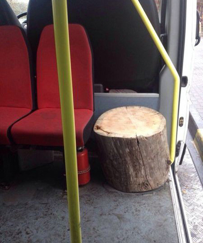Обычный салон маршрутки: потёртый линолеум, красные кресла и... монументальный сосновый пень, скромно приютившийся у входа. Видимо данное посадочное место из массива древесины призвано напомнить пассажирам о неразрывной связи человека с природой, даже если эта связь происходит на скорости 60 км/ч.