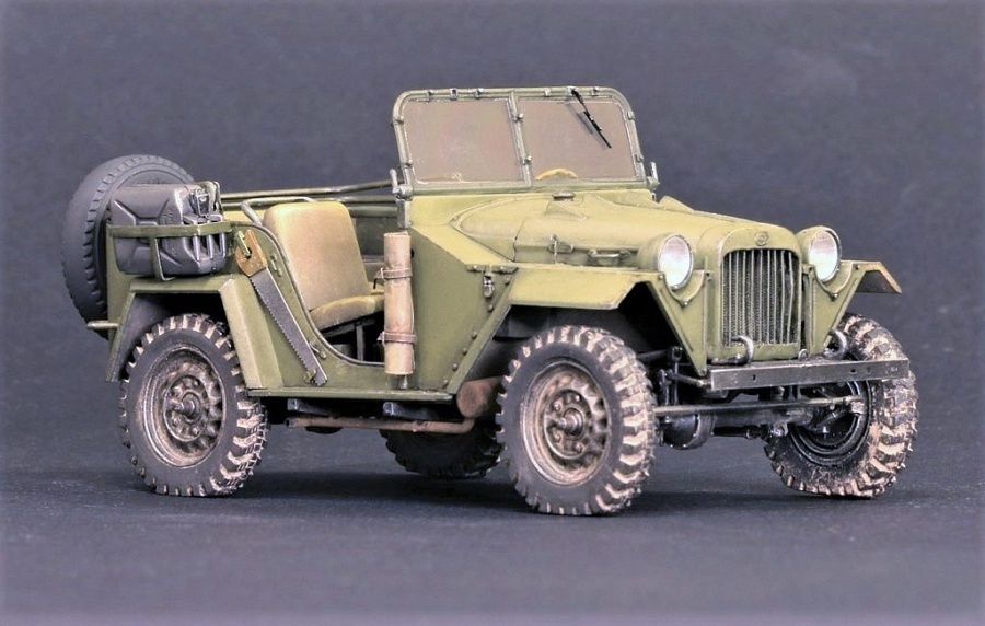 По задумке козлик первой, ранней серии. Автомобиль участвовавший в серии палеонтологических экспедиций Академии наук СССР в Монголию в 1946-1949гг. Единственный момент, который надеюсь предстоит добавить- номерные знаки. На данный момент я их не знаю. Кино отчёт просмотрел покадрово, но из-за низкого качества записи, номера не видны. Прочёл книгу руководителя экспедиции И.А. Ефремова, там нужной мне информации так же нет. Связывался с автором биографии Ивана Антоновича, тоже безрезультатно. Писал путешественникам, любителям Гоббийских просторов-ноль. Палеонтологический музей (в котором выставлены экспонаты, добытые в тех экспедициях) перенаправил меня в РАН, ответа нет. Но я надеюсь, что найду нужную мне информацию, тем более мне предстоит еще один, более глобальный проект из этой же серии. По дополнениям: Фототравление voyagermodel PE 35668, смоляные колёса от hobby planet 35205. Что было дополнено и переделано: в первую очередь переделал решётку радиатора на раннюю, переделал рулевое колесо на раннее, заменил ручки и поручни на проволоку, добавил передние амортизаторы передней подвески, заменил фары на Эльф, добавил топливопровод от бака к фильтру и дальше в подкапотное пространство, изготовил заново крышку заливной горловины топливного бака так как форма крышки из набора не соответствовала, добавил крепление, а так же ещё немного мелочёвки. Покраска: для окраски кузова использовал Акан 4БО, остальное тамия, фильтры АК, масло, смывки тамия, пигменты АК.