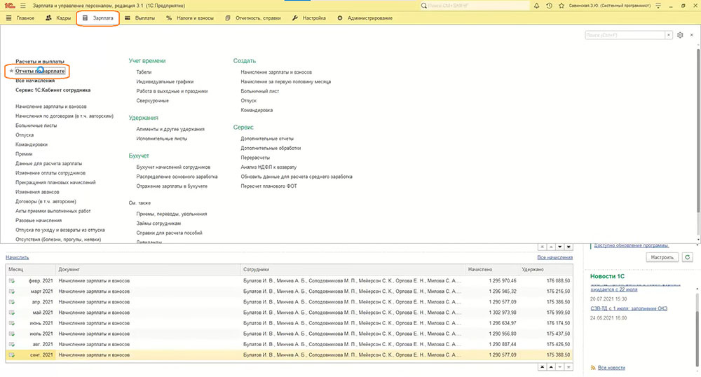 - Идём по знакомому пути: «Зарплата» → «Отчеты по зарплате». Выбираем «Полный свод начислений, удержаний и выплат».