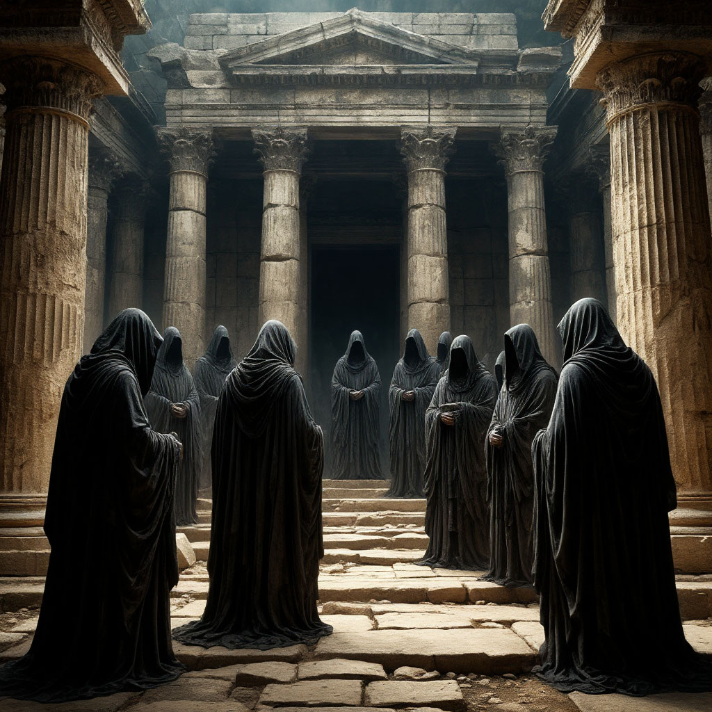 - тёмные фигуры, собирающиеся в древнем храме;