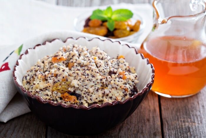 Когда пшеница готова, добавляем в нее перетертый мак и хорошо перемешиваем. Затем добавляем мед. Если хотите, можно добавить измельченные орехи.