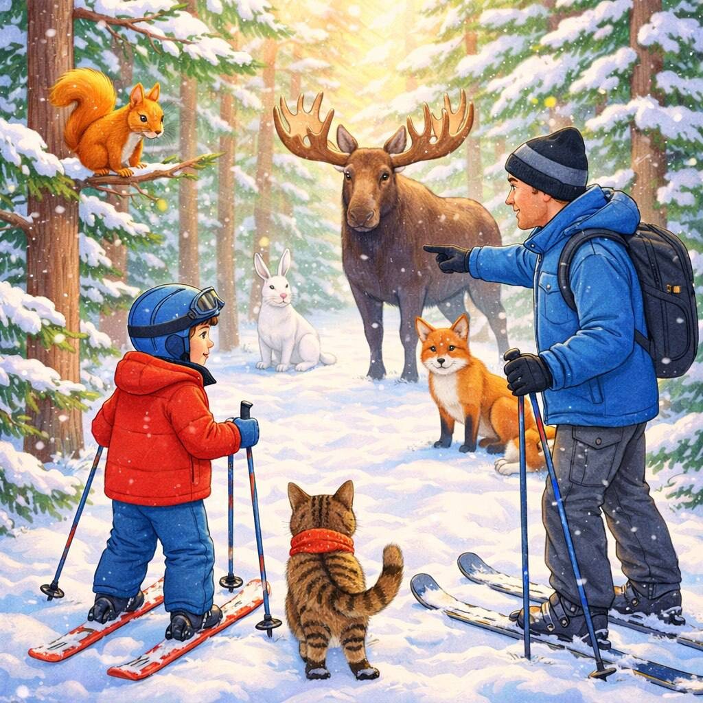 Первый снег лежал пушистым, нетронутым одеялом. Шруппа наших лыжников весело скользили по лыжне. Палёнка бежал рядом на маленьких кошачьих лыжах, иногда останавливаясь, чтобы понюхать снег, а потом снова догонял Ноша и папу.