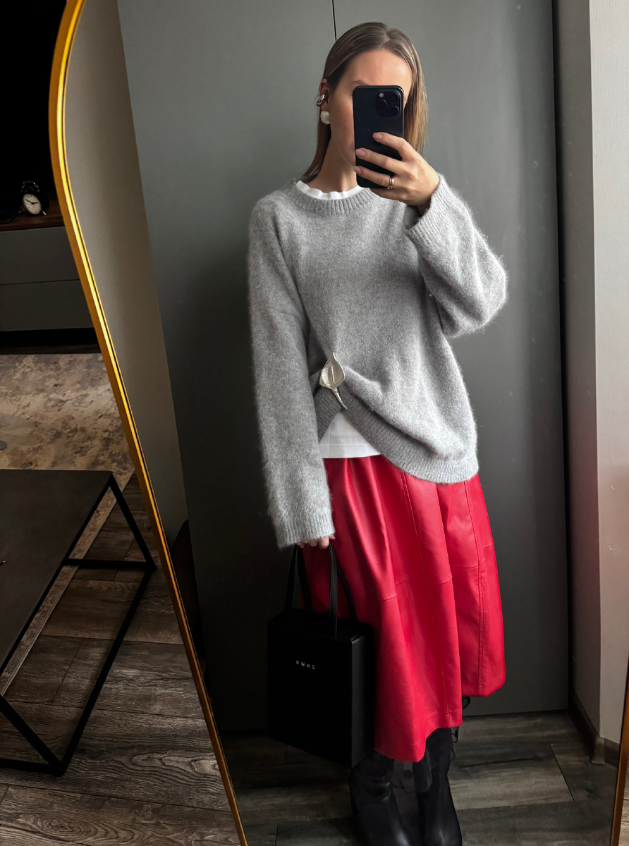 Если хотите добавить цвета в зимний гардероб, то это можно сделать, например, с помощью красной юбки.