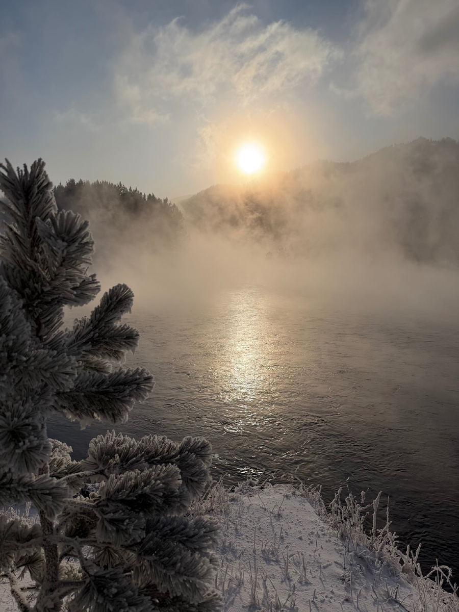 Природа здесь как будто остановила свое течение. Енисей, вечно несущий свои холодные воды, сейчас кажется дремлющим великаном. Он укутался в плотный, густой туман, словно в тяжелое белое одеяло, пытаясь согреться или, наоборот, спрятаться от любопытных глаз.
