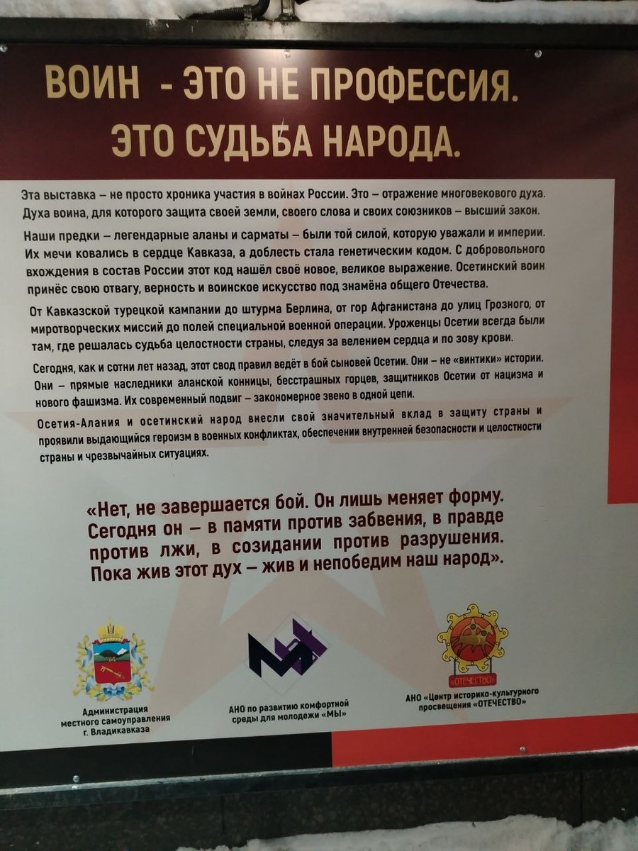 ЭТО СУДЬБА НАРОДА Эта выставка — не просто хроника участия в войнах России. Это — отражение многовекового духа. Духа воина, для которого защита своей земли, своего слова и своих союзников — высший закон. Наши предки — легендарные аланы и сарматы — были той силой, которую уважали и империи. Их мечи ковались в сердце Кавказа, а доблесть стала генетическим кодом. С добровольного вхождения в состав России этот код нашёл своё новое, великое выражение. Осетинский воин принёс свою отвагу, верность и воинское искусство под знамёна общего Отечества. От Кавказской турецкой кампании до штурма Берлина, от гор Афганистана до улиц Грозного, от миротворческих миссий до полей специальной военной операции. Уроженцы Осетии всегда были там, где решалась судьба целостности страны, следуя за велением сердца и по зову крови. Сегодня, как и сотни лет назад, этот свод правил ведёт в бой сыновей Осетии. Они — не «винтики» истории. Они — прямые наследники аланской конницы, бесстрашных горцев, защитников Осе