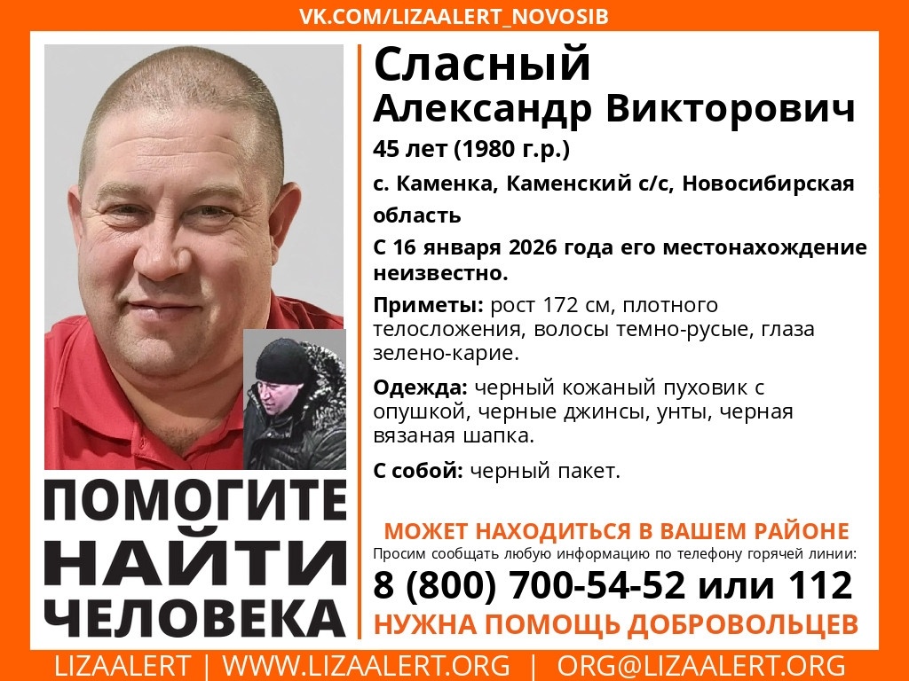 О судьбе Александра Сласного, пропавшего на территории Каменского сельсовета Новосибирской области, ничего не известно с 16 января. В настоящее время его поисками занимаются волонтёры отряда «ЛизаАлерт». Согласно ориентировке поисковиков, рост мужчины составляет 172 см., он плотного телосложения, волосы тёмно-русые, глаза зелёно-карие. Известно, что в момент своего исчезновения Александр Сласный 1980 года рождения был одет в чёрный кожаный пуховик с опушкой, чёрные джинсы, унты и чёрную вязаную шапку. С собой у него был чёрный пакет. Напомним, что в самом Новосибирске в настоящее время продолжаютсяпоиски 50-летней Анны Исаевой, пропавшей в Ленинском районе города 13 января. Если вы обладаете данными о местонахождении этих людей, просьба позвонить на горячую линию отряда 8-800-700-54-52 или 112. P.S. Утром 18 января волонтёры остановили поиск мужчины, сообщив, что он был найден живым. На фото — ориентировка отряда «ЛизаАлерт» https://rberega.info/archives/143130