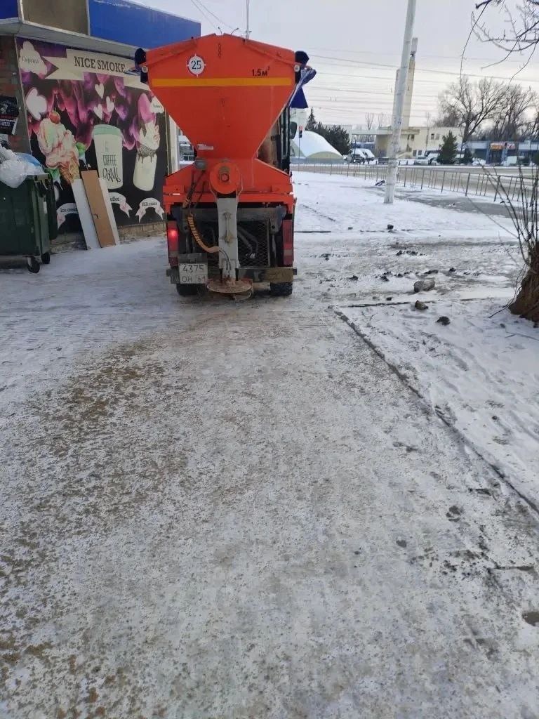 В Волгодонске провели обработку тротуаров пескосоляной смесью после сильнейшего снегопада