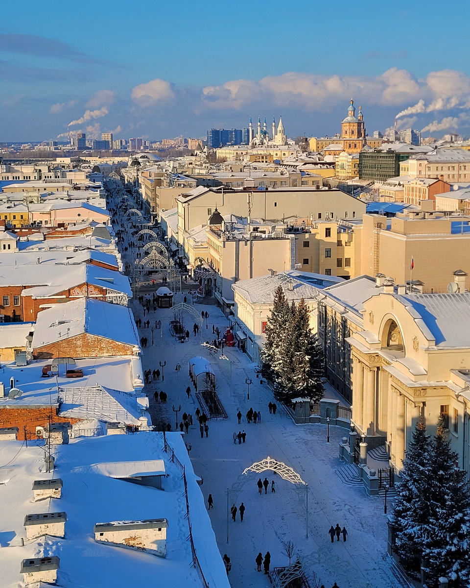 На улице Баумана можно запросто пропасть на целый день. И даже не на один. Там целая вселенная — столько всего. И история начинается ещё в эпоху Казанского ханства. Тогда это была Ногайская дорога. Во время взятия войском Ивана Грозного стены кремля, который здесь же на улице, были проломлены. ...просто Проломной, потом Большой Проломной. Ну а позже была переименована в честь революционера Баумана. И в пешеходную превратилась в наше время — раньше ходили конки, трамваи, троллейбусы, автобусы. И всё это помнят старинные дома — ах, какая там архитектура! ...фасадов (дом 72) сохранены даже исторические вывески — будете гулять по улице, обратите внимание. И на колокольню обязательно — сверху Казанский Арбат особенно прекрасен. В Богоявленском соборе при ней крестили Фёдора Шаляпина — и он часть истории этой улицы. ...можно изучать. Вот копия кареты Екатерины Великой, которая много сделала для города. А вот Алабрыс — легендарный Кот Казанский. Это собирательный образ всех местных усатых-пол