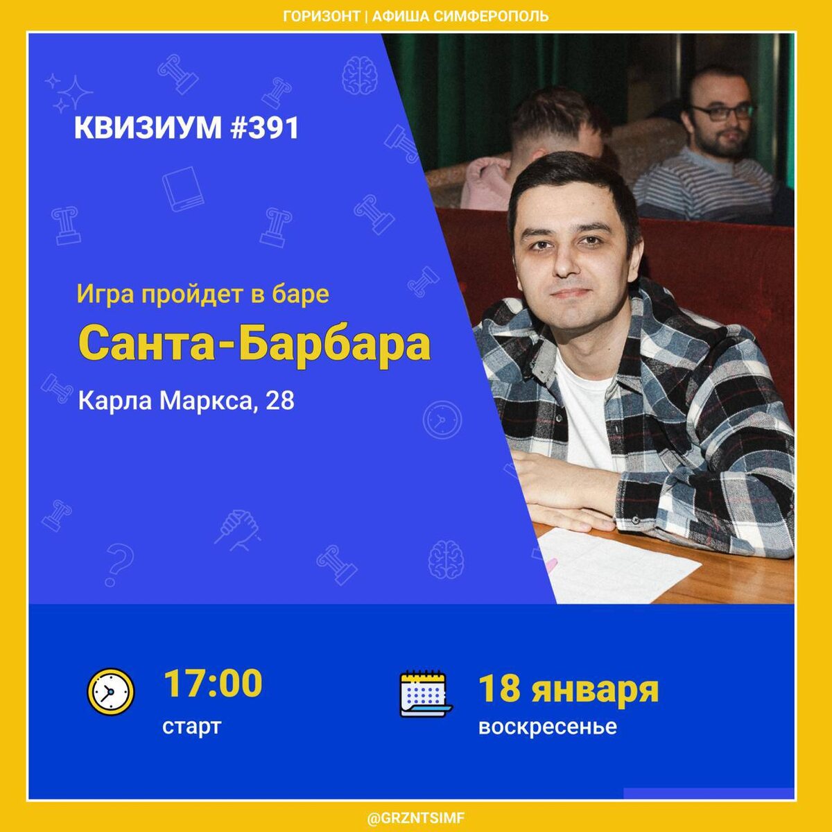 Это не скучная викторина: здесь неожиданные вопросы, командный драйв, море эмоций и возможность проверить себя в самых разных темах — от науки до поп-культуры. 👉 Когда? 18 января в 17:00 👉 Где? Бар Санта-Барбара, ул. Карла Маркса 28. Г. Симферополь 👉 Регистрация, Вход: 500₽ ✨Давай сходим | Крым