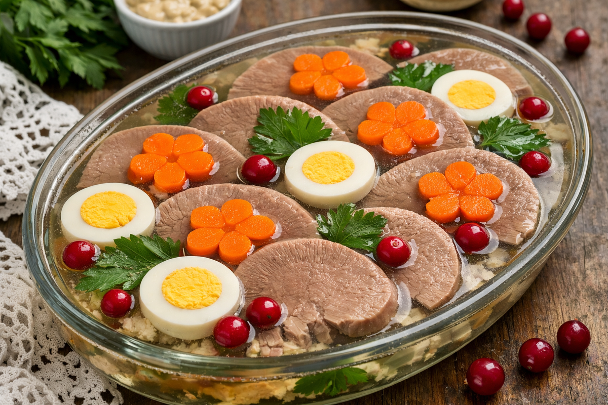 Сегодня хочу поделиться с вами рецептом, который в моей семье считается «королем» праздничного стола. Заливное из говяжьего языка — это не просто закуска, это настоящая кулинарная эстетика. Многие боятся за него браться, думая, что бульон получится мутным или язык будет жестким. Поверьте, если знать несколько секретов, всё получится идеально с первого раза. Давайте готовить вместе! · Говяжий язык — 1 шт. (примерно 1–1.2 кг); · Луковица — 1 шт.; · Морковь — 1 шт. (половина в бульон, половина для декора); · Желатин — 25–30 г (рассчитывайте на 1 литр бульона); · Специи: лавровый лист, душистый перец горошком, соль; · Для украшения: вареное яйцо (перепелиное смотрится нежнее), свежая петрушка, клюква или зерна граната. Язык нужно тщательно вымыть. Кладем его в кастрюлю, заливаем холодной водой и доводим до кипения. Мой секрет: После кипения я всегда сливаю первую воду, промываю язык и заливаю чистым кипятком. Так бульон будет максимально прозрачным. Варим на самом медленном огне 2.5–3 часа