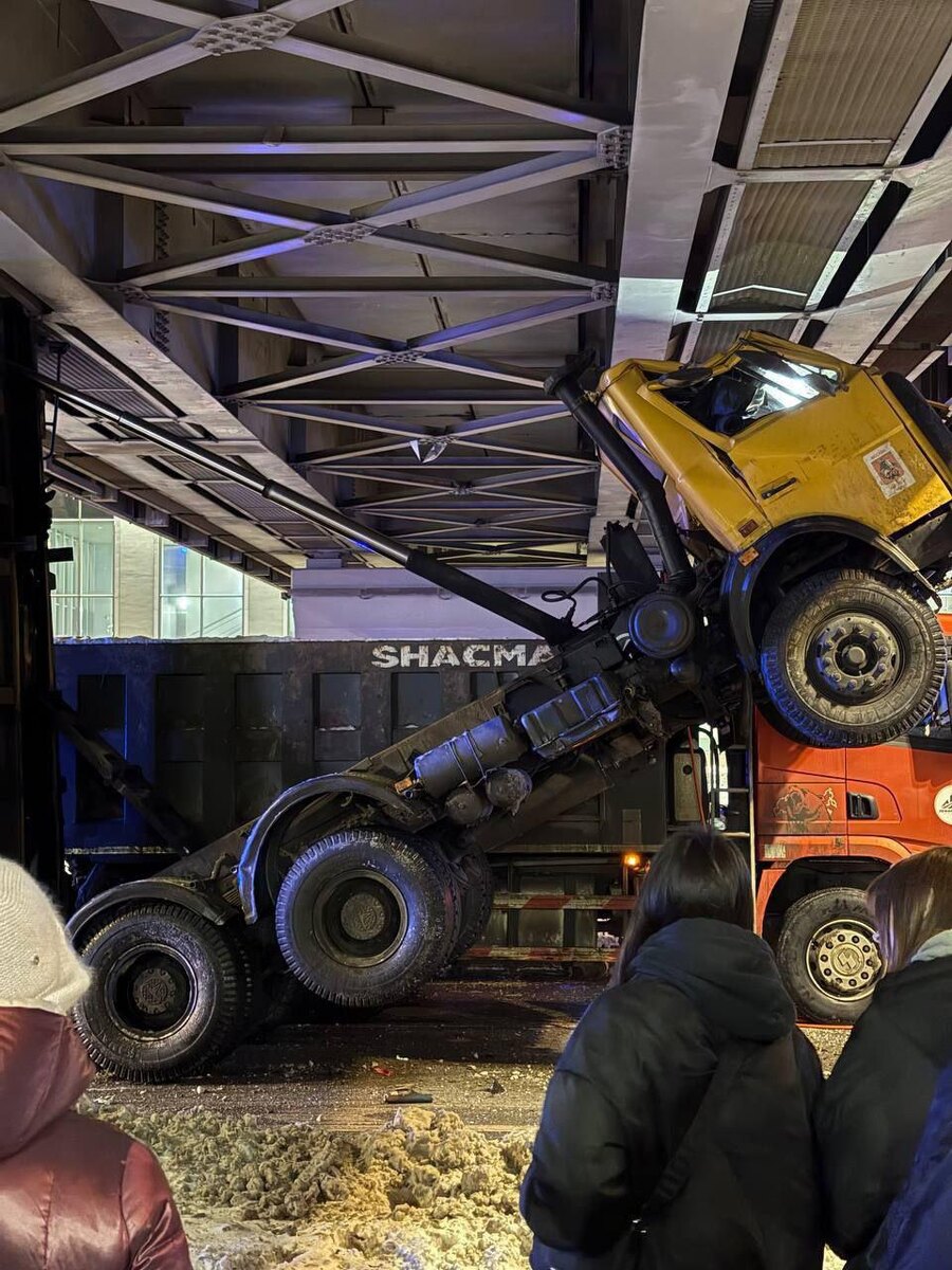📍 Самосвал застрял под мостом у метро «Технопарк»