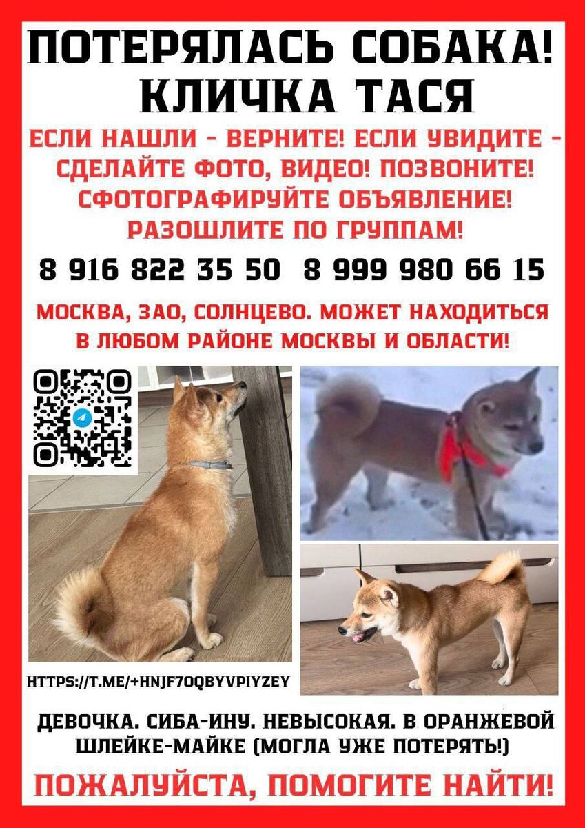 ❗️ ЗАО, МЕЩЕРСКИЙ ПАРК 📍11.01.26 в 16:00 вышла из Мещерского парка к парковке на Новомещерском проезде. Забежала обратно. Была в шлейке. 📍12.01.26 в 18:00 бежала по ул. Родниковой, по проезжей дороге (направление Румянцево). Была очень напугана. 📍15.01.26 в 13:00 Москва, Рябиновая 44 бежала в сторону МЦД Мещерская Девочка, сиба ину, окрас рыжий с белым, оранжевая шлейка (может быть уже без шлейки). Если УВИДЕЛИ - СДЕЛАЙТЕ ФОТО И СРАЗУ ЗВОНИТЕ! : 📞 89168223550 📞 89999806615 Чат поиска: https://t.me/+9uKAxcoyaDk1ZDc6 Распространите, пожалуйста, объявление о поиске 🙏
