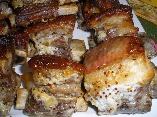 Говяжьи рёбрышки обильно смазать смесью и оставить помариноваться 1-2 часа. Завернуть в пергамент и испечь при 180 гр в течение 1 часа 50 минут.