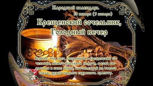 Сочельник ⠀ ВСЕ, КТО ХОЧЕТ ЗАМУЖ: ЖДЕМ ПЕРВОГО ВСТРЕЧНОГО И ПЕРВУЮ ЗВЕЗДУ! ✨ ⠀ 18 января - Крещенский сочельник. Это вечер перед праздником Крещения Господня. ⠀ 19 января - праздник Крещения Иисуса Христа Иоанном Крестителем в реке Иордан. ⠀ Вечер 18 января называется "голодным." Есть можно только постные блюда: каши, овощи. Готовят овощные блины и постные оладьи с мёдом. ⠀ На стол вечером ставят нечетное количество блюд. ⠀ На Крещение снег и вода обладают особенными, целебными свойствами. Поэтому надо запасаться водой, уже начиная с Сочельника. ⠀ Надо навести чистоту, убрать дом (до темноты). ⠀ НЕЛЬЗЯ: ⠀ Слезы лить, думать о плохом, ссориться и брать или давать деньги в долг. ⠀ Мясная пища в этот день может привести к болезни. ⠀ Всем, кто хочет выйти замуж, надо в этот день обратить внимание на "первого встречного". Если это мужчина, то в этом году есть большая вероятность выйти замуж. ⠀ Если загадать желание в этот вечер, глядя на "первую звезду", оно обязательно сбудется! ✨