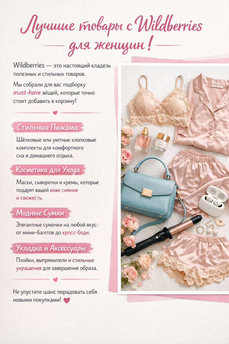 Wildberries — это настоящий рай для покупок, где можно найти всё, от уютных пижам до стильных сумок. Сегодня мы собрали для вас лучшие товары, которые могут добавить элегантности и уюта в ваш гардероб и рутинный уход за собой.