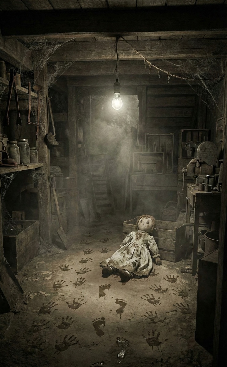 Седьмой день. Утром аккумулятор зарядился от соседского. Я завёл машину, собрал вещи. Перед отъездом спустился в подпол — хотел просто посмотреть ещё раз. Открыл люк. Внизу — темнота. Но когда посветил фонариком — увидел. На земляном полу лежала маленькая кукла. Старая, тряпичная. В платье, как у девочки. А рядом — свежие отпечатки ладошек. Детские. Вокруг куклы. Как будто кто-то только что играл.